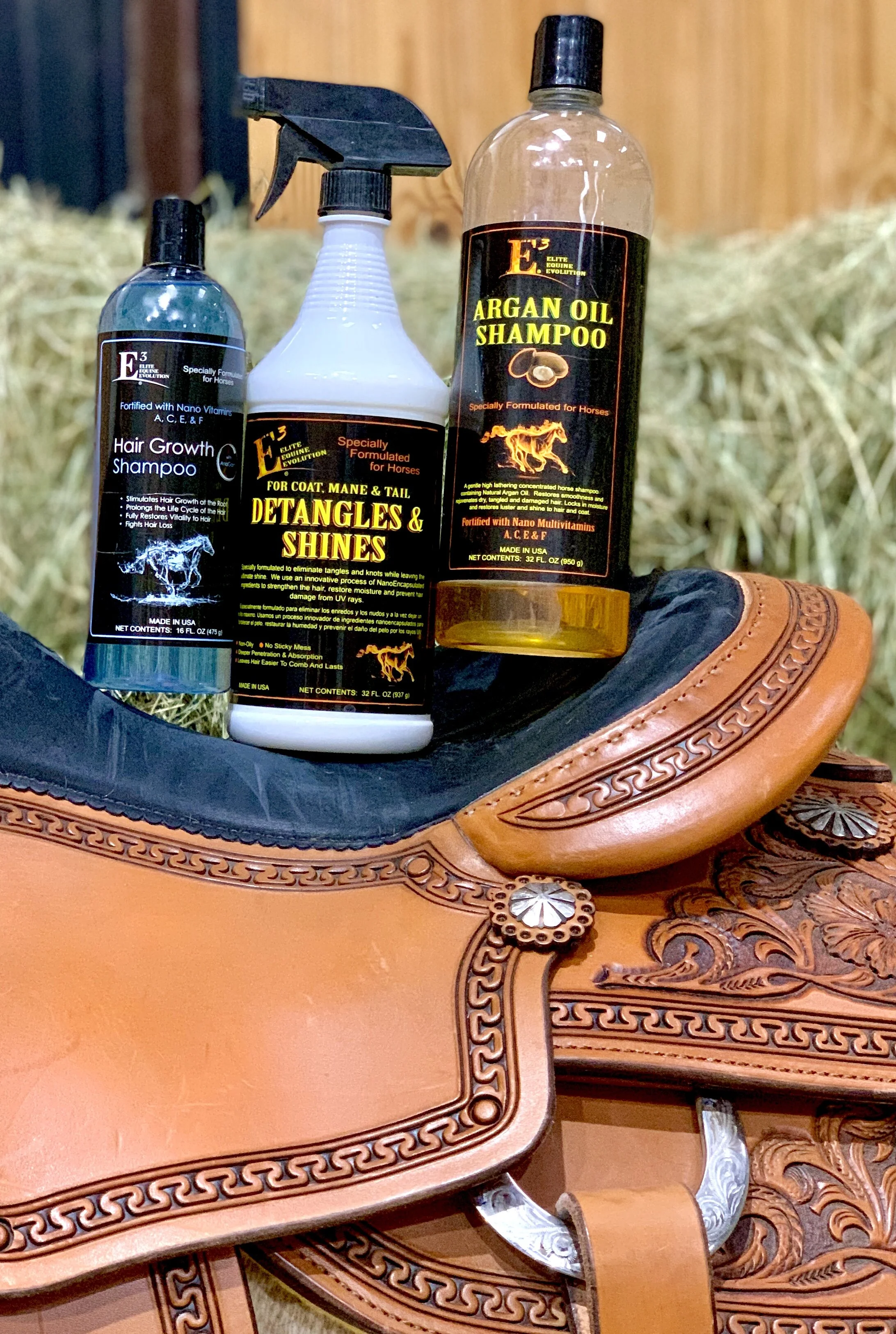 Since this is primarily a horse blog, we can’t forget beauty products for them too. I have been a big fan of E3 Elite Equine Evolution products for awhile and always re-order their Detangler Spray, Argan Oil Shampoo and Hair Growth Shampoo when I run out. I actually hoard and stockpile the Dentagler Spray because it is that good and I can’t be without it. E3 Elite Equine Evolution’s claim to fame is that they use nanotechnology that manipulates molecules to shrink them into microscopic droplets that are easily absorbed by the horse’s skin and coat for maximum effect.