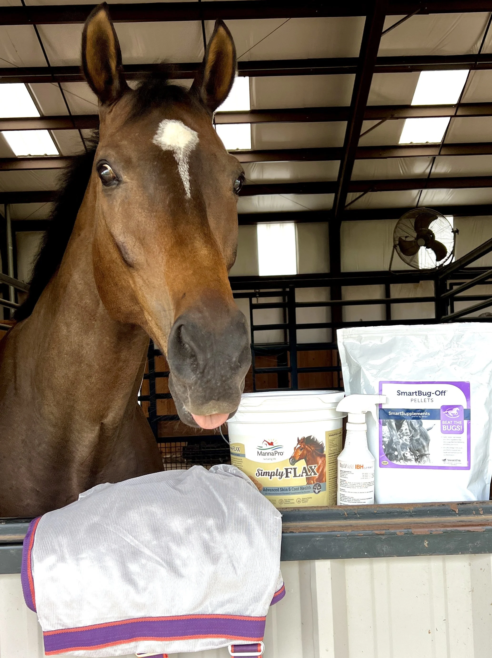 SmartPak’s SmartBug-Off Pellets: These very smelly but amazing pellets fight bugs off with a 3 part process. Apple Cider Vinegar, Brewer’s Yeast and Garlic deter biting insects, MSM and Omega 3 Fatty Acids support normal inflammatory response and healthy skin and diatomaceous earth discourage flies from breeding in manure. I definitely notice that bugs and flies avoid my horses when they are on this. You can learn more about this supplement here.